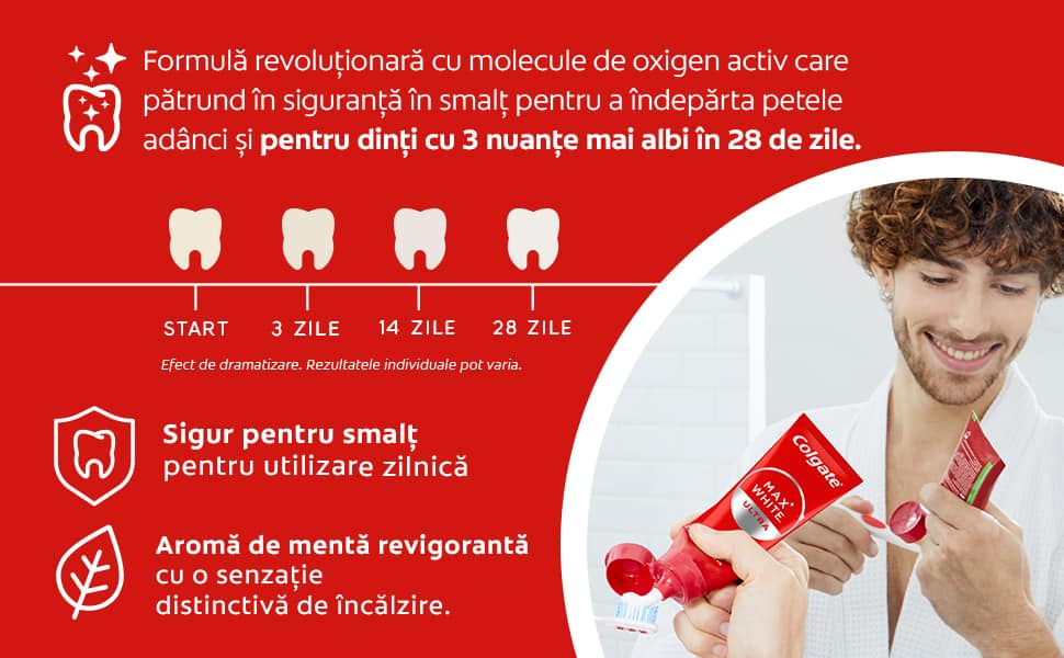 Există diferite modalități de a vă albi dinții acasă. De la paste de dinți la lumini LED de albire a dinților, Colgate Max White vă acoperă. Dacă sunteți în căutarea a ceva ce poate deveni cu ușurință parte din rutina zilnică, încercați o pastă de dinți de albire a dinților precum Colgate Max White Ultra, care vă oferă dinți mai albi în doar 3 zile* sau Colgate Max White Ultimate pentru a inversa ani de pete profunde și îngălbenire.